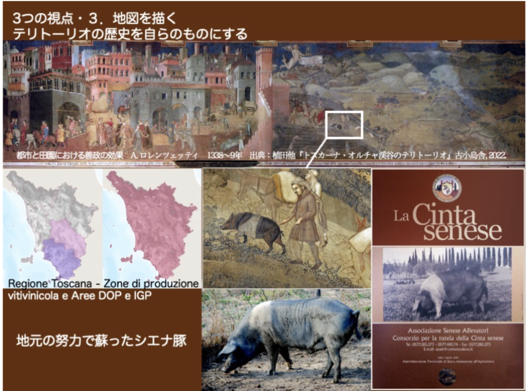 もう一つの例として、先ほど紹介した1338年の絵画に描かれた豚の話をします。ヨーロッパで美味しい豚肉といえば、スペインのイベリコ豚が有名です。私もイタリアにいて、そう思っていました。ところが実は、イベリコ豚よりも美味しい「シエナ豚」が存在します。この豚は第二次世界大戦前までは血統証もあり、ルーツがすべて分かっていたのですが、飼育に手間がかかり、餌の問題などもあって絶滅の危機に瀕していました。