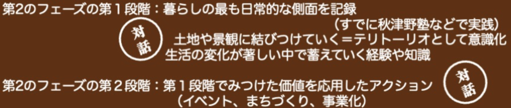 植田(引き続き) テリトーリオの話題に戻ると、先ほどの図の一番下の部分に記した、営農していること、フェーズ1の人々の交流で日常を浮き彫りにすること、フェーズ2の…おそらく下田さんが言われているイベントや事業化と関連づけられる思いますが…これらが重なることによって、上秋津もしくは田辺のテリトーリオとしてのパイロット的、ミニチュア的、あるいは世界観を伝達する動き、つまりテリトーリオの象徴的な存在として、コモンズ農園を捉えています。