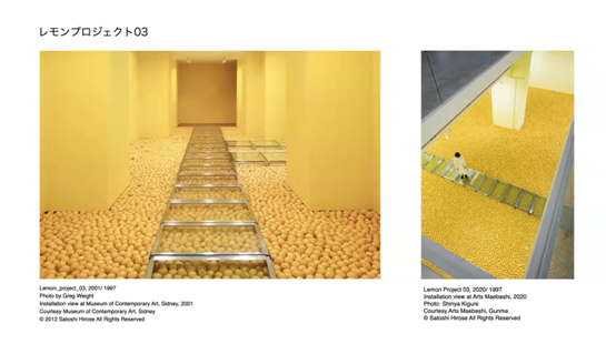 2020年に開催したアーツ前橋での展覧会では、レモンを3万5000個使った作品を展示しました。香りが漂うような作品で、視覚的にも圧倒される空間でした。普通の人が100個くらいしか見たことのないレモンが、3万5000個ある異世界のような景観。それを見た人たちは、やっぱり驚きます。